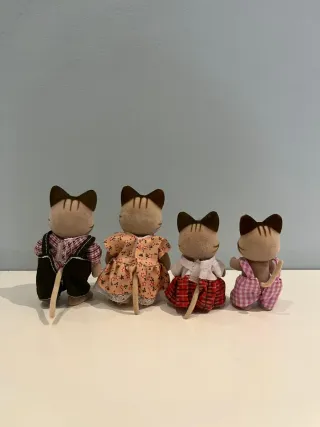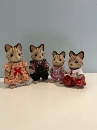 Familia de gatos rayados de Sylvanian Families. Incluye 4 figuras. - Figuras con ropa detallada. - Ideal para coleccionistas y juego. - Diseño clásico de Sylvanian Families. Son caja. Como nuevos, solo expuestos
