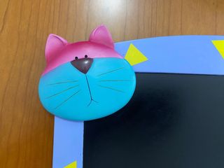 Pizarra de tiza con forma de gato, ideal para niños. Es pequeña y colorida, perfecta para dibujar o escribir mensajes. - Diseño de gato en colores azul y rosa. - Marco de madera. - Superficie de pizarra negra. - Se puede colgar.