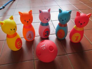 Juego de bolos infantil "Ludi"con 5 bolos de plástico con forma de gato y una bola con agujeros como las profesionales. Los bolos son de colores alegres y están en buen estado. Tamaño bolos: 14cm. alto y unos 5cm. de ancho. Tamaño bola: unos 8 cm. de diámetro Mira mis otros artículos para ahorrar en gastos de envío.