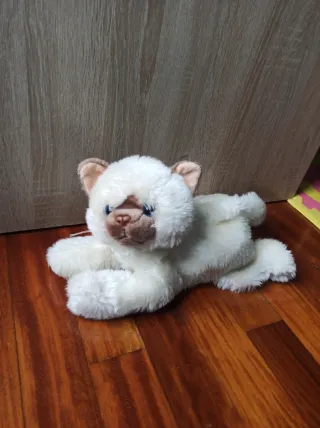 Adorable peluche de gato de color blanco, perfecto para coleccionar o regalar. Suave al tacto,mide 35 cm. - Color: Blanco con detalles en marrón claro. - Ojos: Azules. - Nariz: Rosa. - Material: Felpa suave.