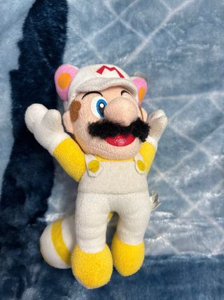Set de tres peluches de personajes de videojuegos. - Peluche de Mario con su icónico traje. - Peluche de Toad con su característico sombrero. - Peluche de Cat Mario con orejas y cola de gato.