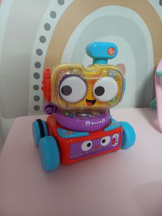 Juguete robot tito. Es muy divertido, les ayuda a gatar, con sonidos, camciones y colores. se mueve para q le sigan los peques goteando.. y apretando la palanca azul gira los ojos. A mi peque la gusto mucho. Esta perfectamente sin raspones ni rasguños.