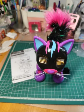 Divertido gato interactivo Zoomer Meowzies. - Diseño moderno con detalles en púrpura y azul. - Ojos LED que muestran expresiones. - Cola con pelo rosa y negro. - Bigotes blancos.