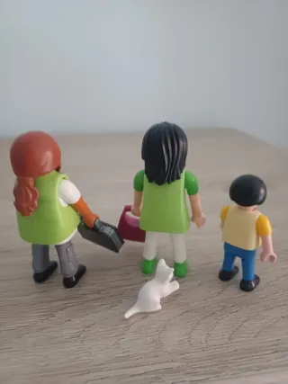 Conjunto de figuras Playmobil que incluye una familia y su mascota. - Figura de adulto con barba y chaleco verde. - Figura de adulto con camiseta a rayas y bolso. - Figura infantil con camiseta a rayas. - Figura de gato blanco.