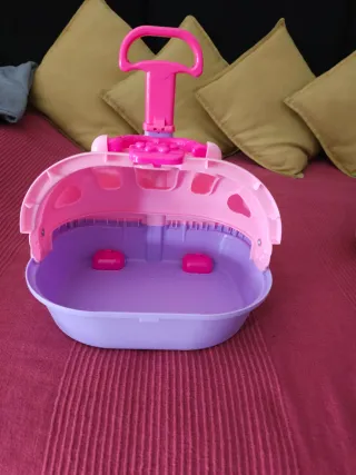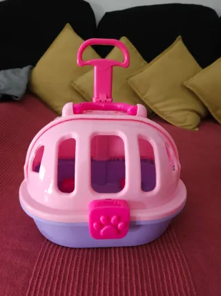 Este carrito de juguete es perfecto para llevar a tus mascotas de peluche. - Diseño en color rosa y lila. - Asa plegable para facilitar el transporte. - Puerta con cierre y huella de patita.