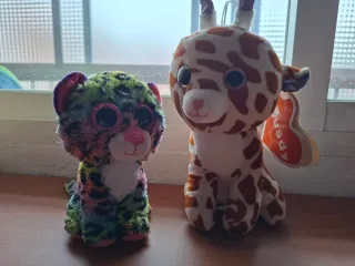 Set de dos peluches, un gato y una jirafa. - Peluche de gato multicolor con detalles brillantes. - Peluche de jirafa con estampado de manchas. Jirafa tiene etiqueta incluso