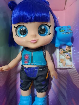 Muñeca Zoey con su adorable compañero gatuno. - Muñeca con pelo azul y ojos brillantes. - Incluye un pequeño accesorio de gato azul. - Ropa de moda con detalles coloridos.