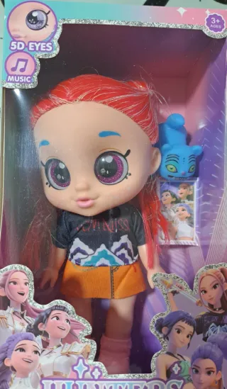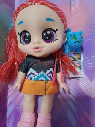 Muñeca Mira con su accesorio de gato azul. - Muñeca con cabello rojo y detalles brillantes. - Incluye un pequeño gato azul. - Ropa de la muñeca: camiseta negra con diseño y falda naranja.