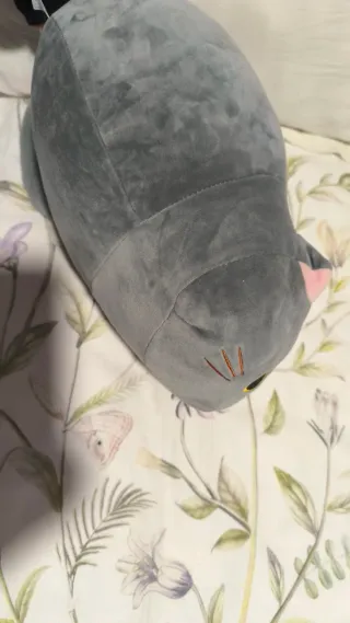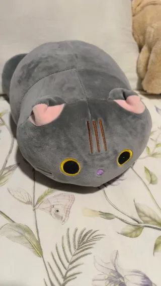 Adorable peluche de gato gris, perfecto para abrazar. Suave al tacto y con un diseño encantador. Algo desgastado por la parte de la cola pero por lo demás está perfecto. - Color: Gris - Orejas: Rosas - Ojos: Amarillos con negro - Nariz: Morada