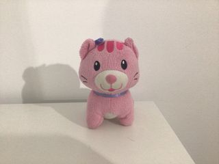 Adorable peluche de gato de color rosa, perfecto para coleccionar o regalar. - Diseño tierno y suave. - Detalles de rayas y lazo en la cabeza. - Collar azul alrededor del cuello. - Tamaño 16 cm