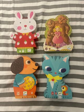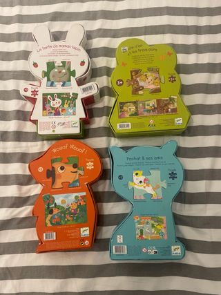 Set de 3 puzzles de la marca Djeco, cada uno con 24 piezas y recomendado para mayores de 3 años. Incluye un puzzle de un conejo, uno de un perro y uno de los tres osos con una niña. ! el puzzle de un gato viene de regalo, está en peores condiciones.! precio por 3 cajas + 1 de regalo