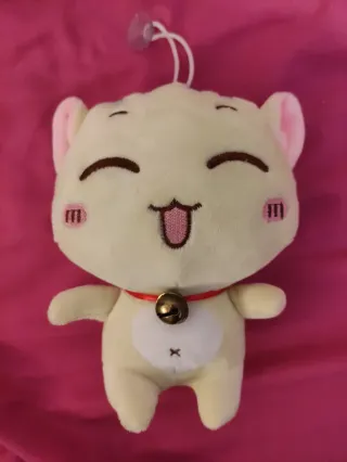 Adorable peluche de gatito con un diseño tierno y sonriente estilo japonés. Perfecto para coleccionar o regalar. Mide unos 17cm - Cuerda con ventosa para colgar Kawaii adorable