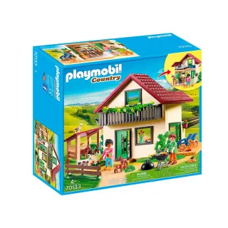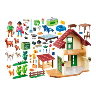 Set de juego de Playmobil que representa una casa de granja con sus habitantes y animales. - Incluye figuras de personas y animales como vacas y un gato. - Accesorios de granja como carretilla, fardos de heno y herramientas. - Casa de dos plantas con balcón y detalles. - Establo para los animales. No incluye la caja