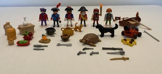 Lote de figuras y accesorios de la serie piratas de Playmobil. Incluye 6 figuras y muchos accesorios: cañón, armas, cofre tesoro, caldero, jarras, barril… además de una tortuga, un perro y un gato (todo lo que se puede ver en las fotografías). Muy buen estado; tan solo en alguna parte puede haber alguna señal de uso (ver fotografías). Lote completo. No se divide. No vendo figuras o piezas sueltas. He incluido accesorios extra: pañuelo, 2 puños, correaje para sable, barba y base para munición de cañón (foto 8). Pinchando en el perfil puedes encontrar más anuncios de Playmobil. Entrega en mano o envío a través de Wallapop