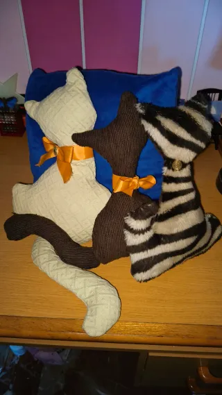 Conjunto de tres peluches con forma de gato hecho a mano, ideales como adorno. - Un peluche es de rayas blancas y negras. - Dos peluches son de color crema y marrón oscuro. - Cada uno lleva un lazo naranja.