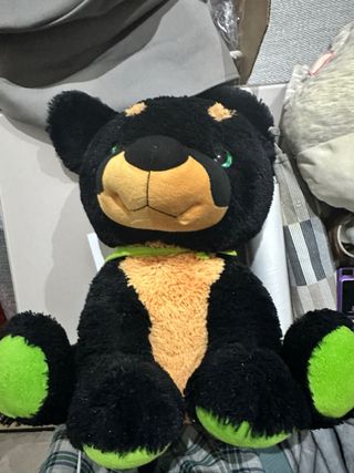 Peluche de perro con detalles en naranja y verde. - Pelaje negro. - Orejas y manchas en la cabeza en negro. - Detalle de color naranja en el pecho y abdomen. - Patas delanteras y traseras con detalles en color verde brillante. - Ojos verdes. - Collar verde.