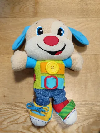 Peluche interactivo de un perrito de Fisher Price. Se puede abrochar y desabrochar la hebilla de Perrito, abrir y cerrar la cinta de su zapato, atar sus cordones y abrochar y desabrochar el botón de su bolsillo Cuerpo de tela suave. Pulsas en el pecho y canta 30 canciones, sonidos de animo, frases de hábitos diarios. Ropa de colores con diferentes texturas