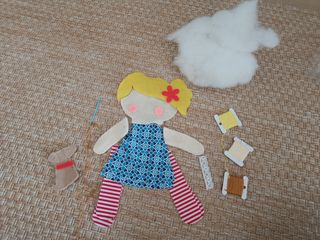 Juego de fieltro para coser muñeca y perro.Está nuevo,pero falta ojos de muñeca y pelo posterior.