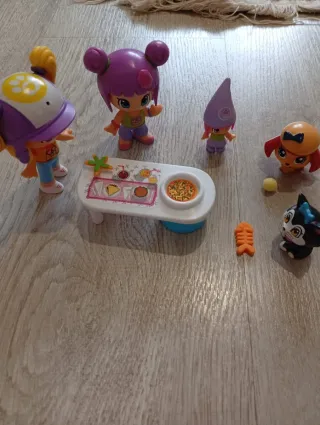 Set de figuras Pinypon con accesorios. - Incluye varias figuras de Pinypon. - Accesorios para jugar, como una mesa con comida. - Incluye un gato y un perro.