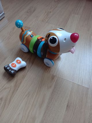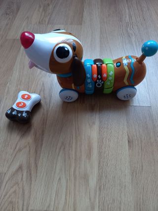 Perrito musical con luz, ladridos y melodías. Originalmente, con el mando se podía mover al mismo tiempo que ladraba, pero ahora cuando se apretan los botones del mando solo ladra. El piano del perro funciona perfectamente.