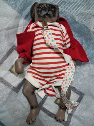 Muñeco realista con forma de perro pug bebé, ideal para coleccionistas o como accesorio. - Cuerpo de vinilo suave. - Ropa a rayas rojas y blancas. - Incluye chupetero con diseño de huellas.