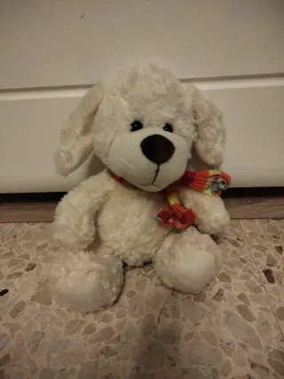 Adorable peluche de perro de color blanco, perfecto para abrazar. Lleva una colorida bufanda. - Material suave y tierno. - Diseño de perro amigable.