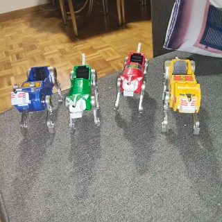 Conjunto de figuras de acción de Megazord de Power Rangers. - Figura verde con ruedas. - Figura roja con patas. - Figura amarilla. - Figura dorada. - Figura circular gris con detalles rosas. - Figura azul con cabeza de dragón.