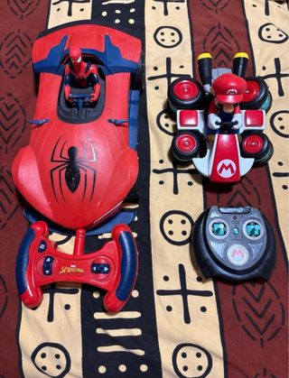 Set de dos coches teledirigidos, uno de Spiderman y otro de Mario Kart. - Coche teledirigido de Spiderman con figura. - Coche teledirigido de Mario Kart con figura. - Mando teledirigido para el coche de Spiderman. - Mando teledirigido para el coche de Mario Kart.