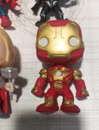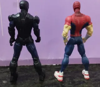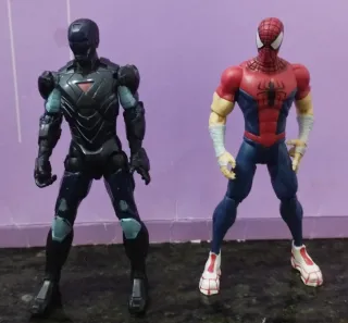 Se venden figuras de acción de Iron Man y Spider-Man. - Figura de Iron Man con armadura negra. - Figura de Spider-Man con traje rojo y azul.