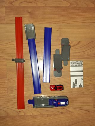 Pista de coches infantil de Spiderman. Incluye coche de juguete. No se ha usado nunca, aunque las piezas vienen sueltas en la caja