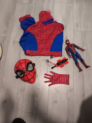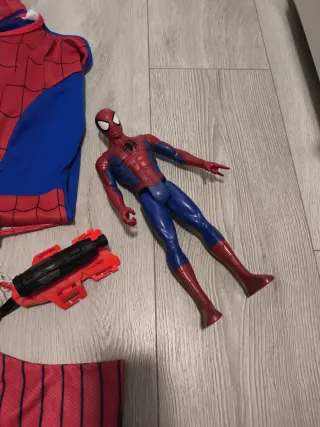 Conjunto de artículos del personaje Spiderman. - Disfraz talla 4 - 5 años - Máscara - Guante. - Lanzador de dardos brazalete - Figura de acción articulada.