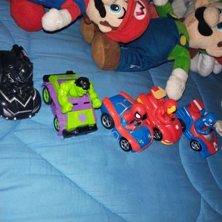 Lote de 5 coches de superhéroes. - Coche negro de Batman. - Coche verde del Hulk. - Coche rojo de Spiderman. - Coche rojo de Iron Man. - Coche azul de Capitán América.