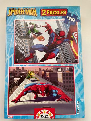 Dos puzzles con imágenes de Spiderman y sus amigos. - Puzzle 1: Spiderman en la ciudad. - Puzzle 2: Spiderman con otros héroes como Luke Cage, Iron Fist y White Tiger.