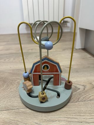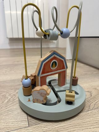 Juego de mesa de madera con diseño de granja para niños. Incluye un circuito de cuentas y figuras. - Base redonda de madera con diseño de granja. - Circuito de alambre con cuentas de colores y formas. - Figuras de animales de madera. - Incluye un pequeño tractor y una casita de granja.
