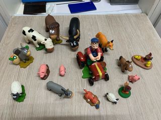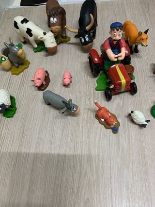 Conjunto de figuras de animales de granja y un tractor. Ideal para juegos infantiles. - Incluye un tractor y más de 20 figuras de animales de plástico. - Los animales son de colores variados y parecen estar en buen estado. - Perfecto para estimular la imaginación y el juego creativo.