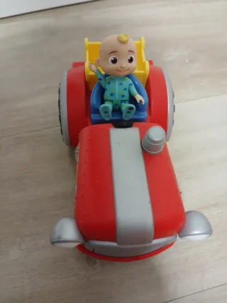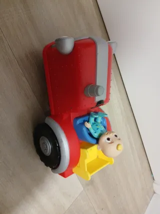Divertido tractor de juguete con figura de Cocomelon. - Color rojo principal. - Figura de personaje incluida. - Detalles plateados en la parte delantera y ruedas. - Volquete amarillo en la parte trasera.
