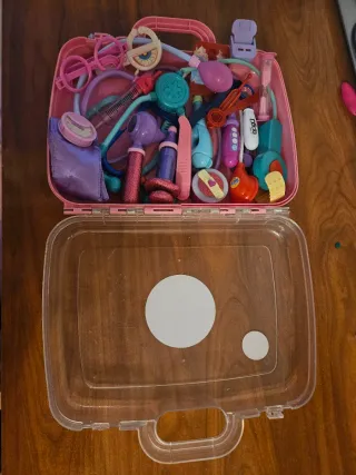 Maletín de médico de juguete con varios accesorios. - Maletín transparente con detalles rosas. - Incluye estetoscopio, jeringuilla y otros instrumentos médicos de plástico. - Adorno con cruz roja y símbolo médico.