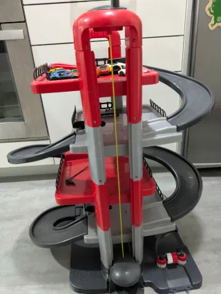 Parking de juguete de varios niveles con rampas y coches. - Incluye varios coches de juguete. - Estructura de plástico rojo y gris. - Rampa en espiral.