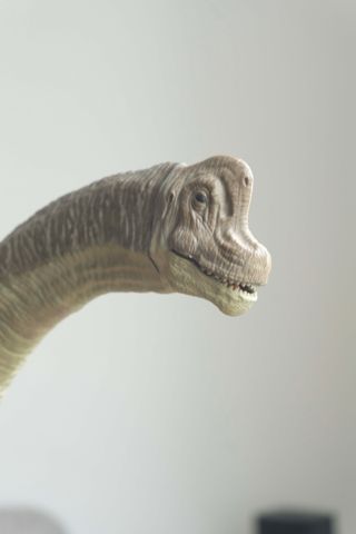 Figura de dinosaurio de juguete con un diseño realista y detalles en color marrón. - Color marrón con vetas más oscuras. - Cuello largo y cola curvada.