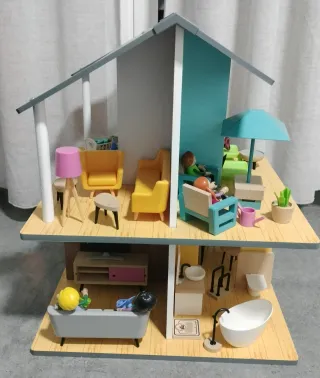 Casita de juguete de madera con varios niveles y habitaciones. - Incluye figuras y mobiliario. - Diseño de dos plantas. - Terraza exterior con sombrilla.
