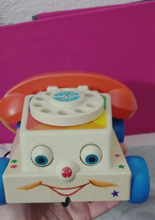 Teléfono de juguete clásico de Fisher Price, con un diseño divertido y colorido. - Rueda giratoria para marcar. - Cara sonriente con ojos grandes y nariz roja.(Tiene un poco quitada la pintura de la nariz) Adjunto fotos - Decorado con estrellas y arcoíris. - Asa para transportarlo.