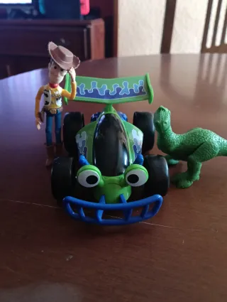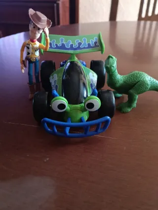 Set de juguetes de Toy Story. - Figura de Woody. - Coche de carreras verde. - Figura de dinosaurio verde. Woody cuesta ponerse de pie