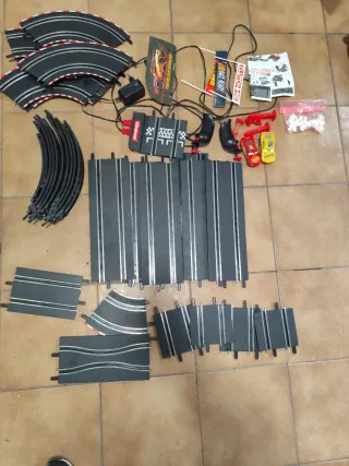 Circuito de carreras Carrera GO con temática de Rayo McQueen. Incluye varios tramos de pista y accesorios. No neg - Tramos de pista rectos y curvos. - Dos mandos de control. - Dos coches de carreras. - Transformador y puente de conexión.