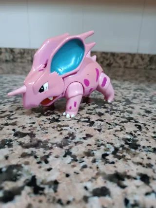 Figura de Nidorino, el Pokémon de color rosa. Cuando le mueves las patas de atrás hacia delante, mueve la boca. - Detalle de orejas azules. - Puntos morados en el cuerpo. - Cuerno en la cabeza.
