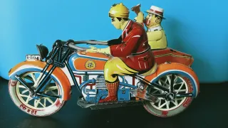 Réplica de juguete de una motocicleta con sidecar de la marca PAYA. Un diseño clásico y detallado. - Fabricado en metal. - Colores vibrantes: naranja, azul y blanco. - Figuras de pilotos con cascos y vestimenta detallada. - Ruedas con radios y detalles impresos.