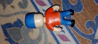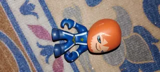 Figura de juguete de un niño con casco. - Cuerpo de color naranja y azul. - Cabeza blanca con detalles negros. - Casco amarillo y azul.