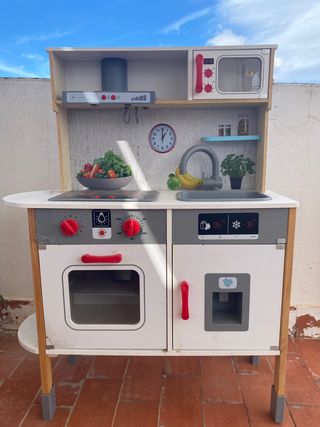 Divertida cocinita de juguete de madera, perfecta para horas de juego. - Diseño moderno con acabados en blanco y turquesa. - Incluye horno, microondas, fogones y fregadero y accesorios de cocina ( ollas , sartenes, etc) - Estanterías para almacenar accesorios. - Detalles como reloj y mandos. - Ideal para fomentar la imaginación.