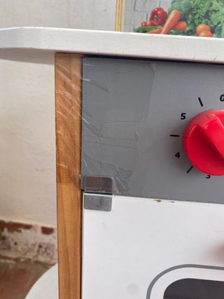 Divertida cocinita de juguete de madera, ideal para los más pequeños. - Incluye horno, microondas y fregadero. - Cuenta con fogones, reloj y accesorios. - Diseño colorido y atractivo.