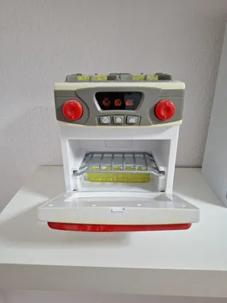 Horno de juguete con diseño moderno y divertido. - Encimera con quemadores simulados. - Puerta de horno con asa roja. - Bandeja interior. - Botones y pantalla decorativos. - Tiene luces.