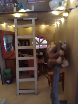 Casita de juguete estilo chalet, elaborada a mano con gran detalle. - Diseño de dos plantas. - Incluye mobiliario y accesorios. - Decorada con luces LED.